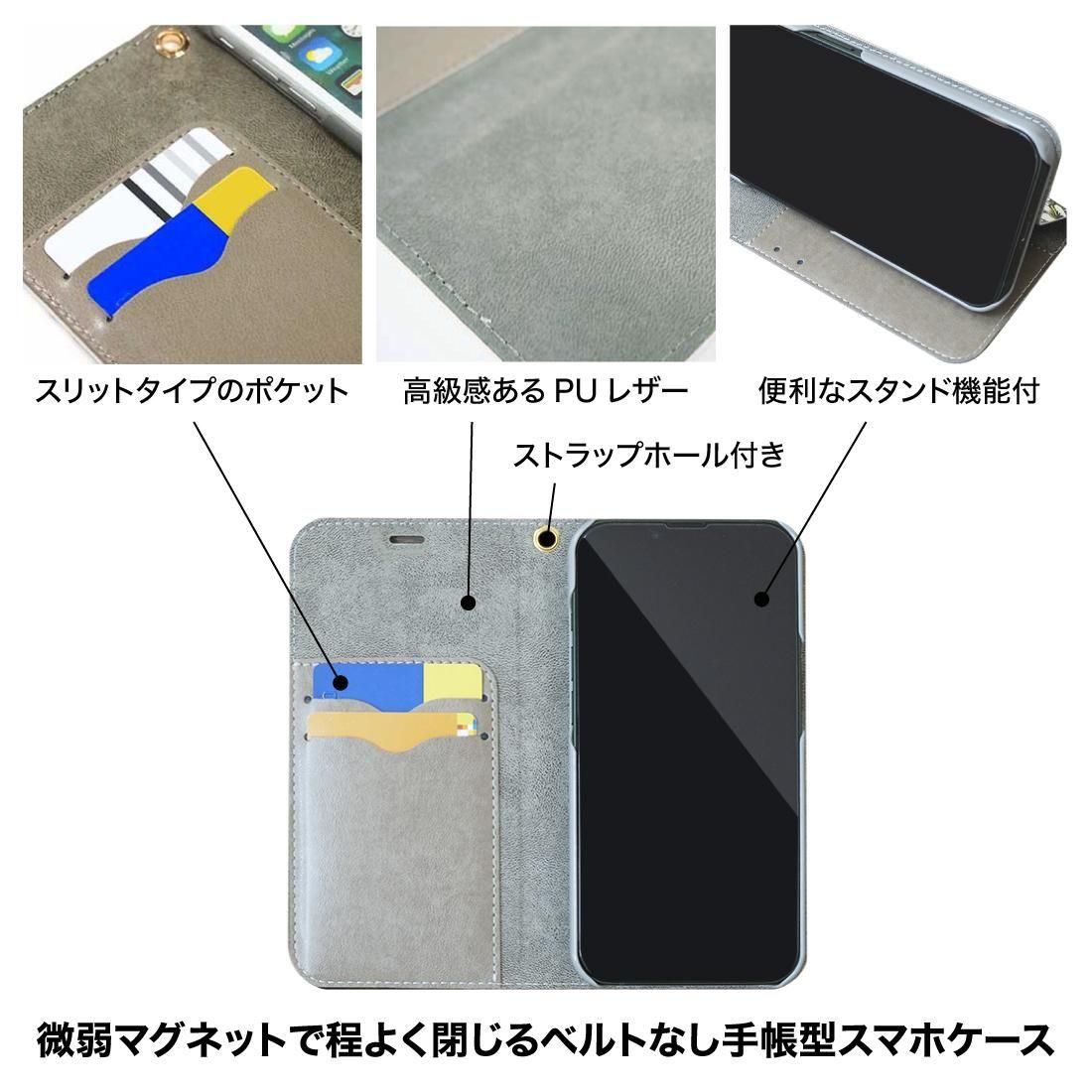 ベルト(帯)部分がなくスタイリッシュな印象の手帳型スマホケース。微弱マグネットで程よくパチッと閉じることができ、簡単に開け閉めが可能です。